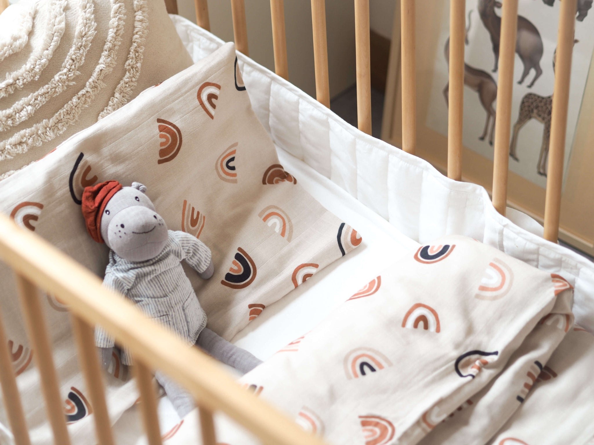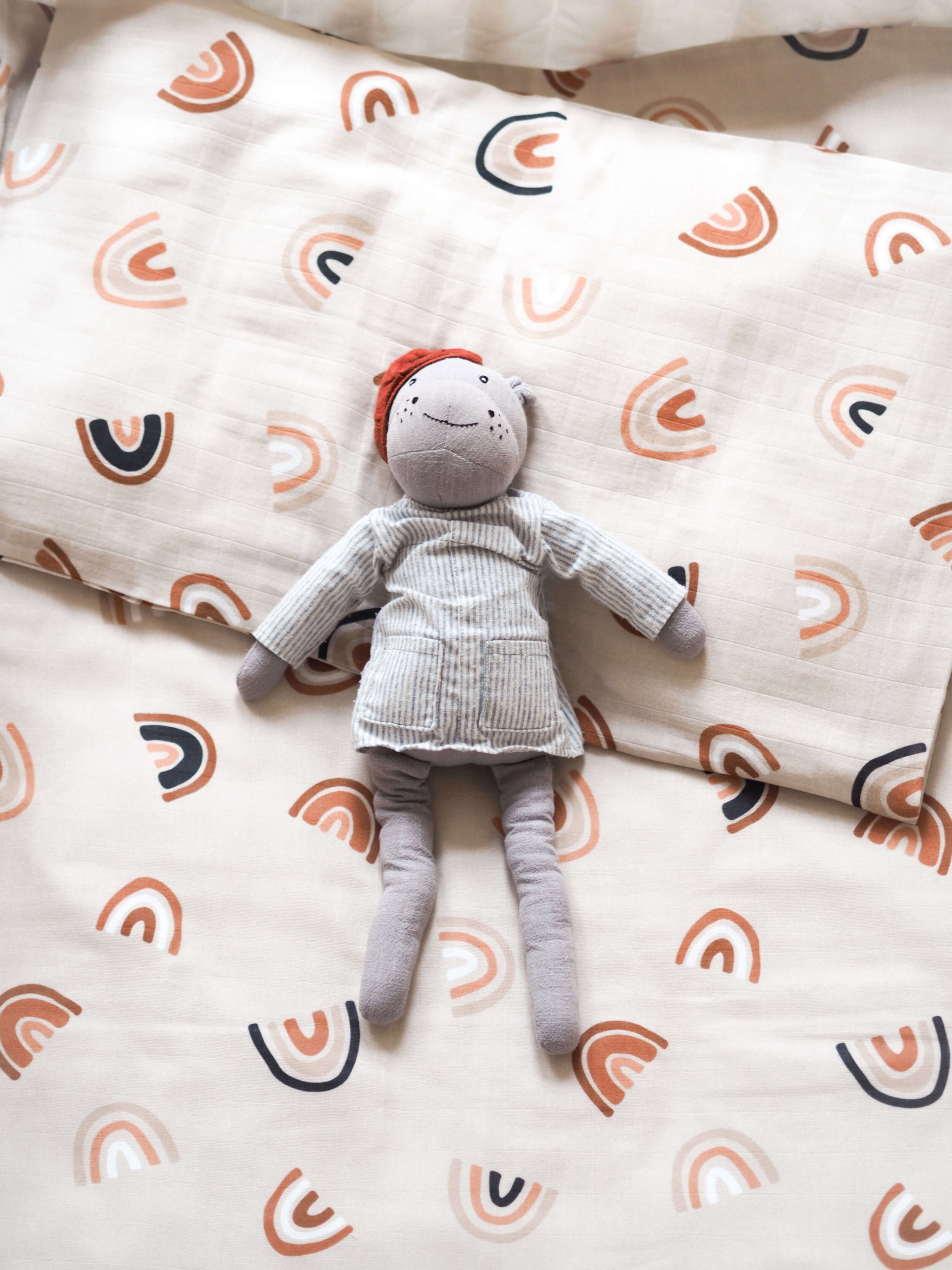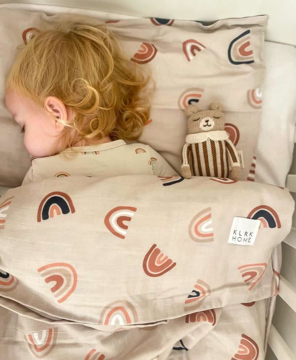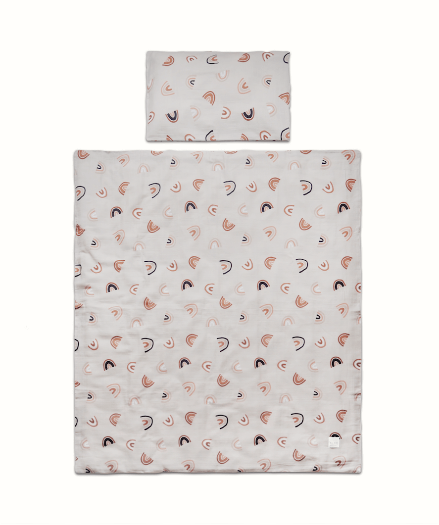 Souprava povlečení do dětské postýlky z mušelínu s certifikací GOTS. Mušelín je velmi příjemný materiál a vašim dětem se v něm bude krásně spinkat. Povlečení obsahuje jeden povlak na polštář s obálkovým zavíráním a jeden potah na peřinu se zapínáním na patentky. Nádherný design s duhami je univerzální a nadčasový.