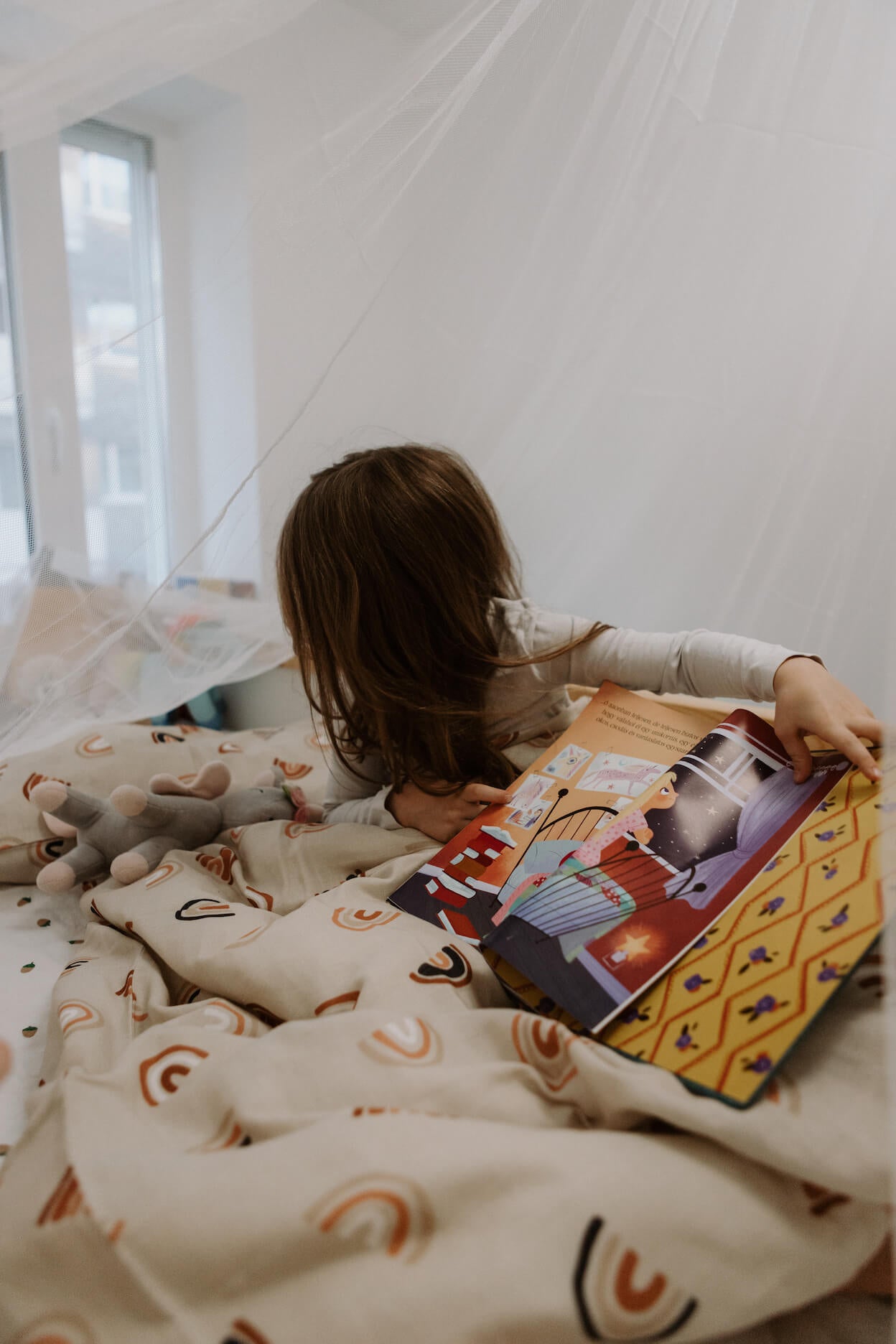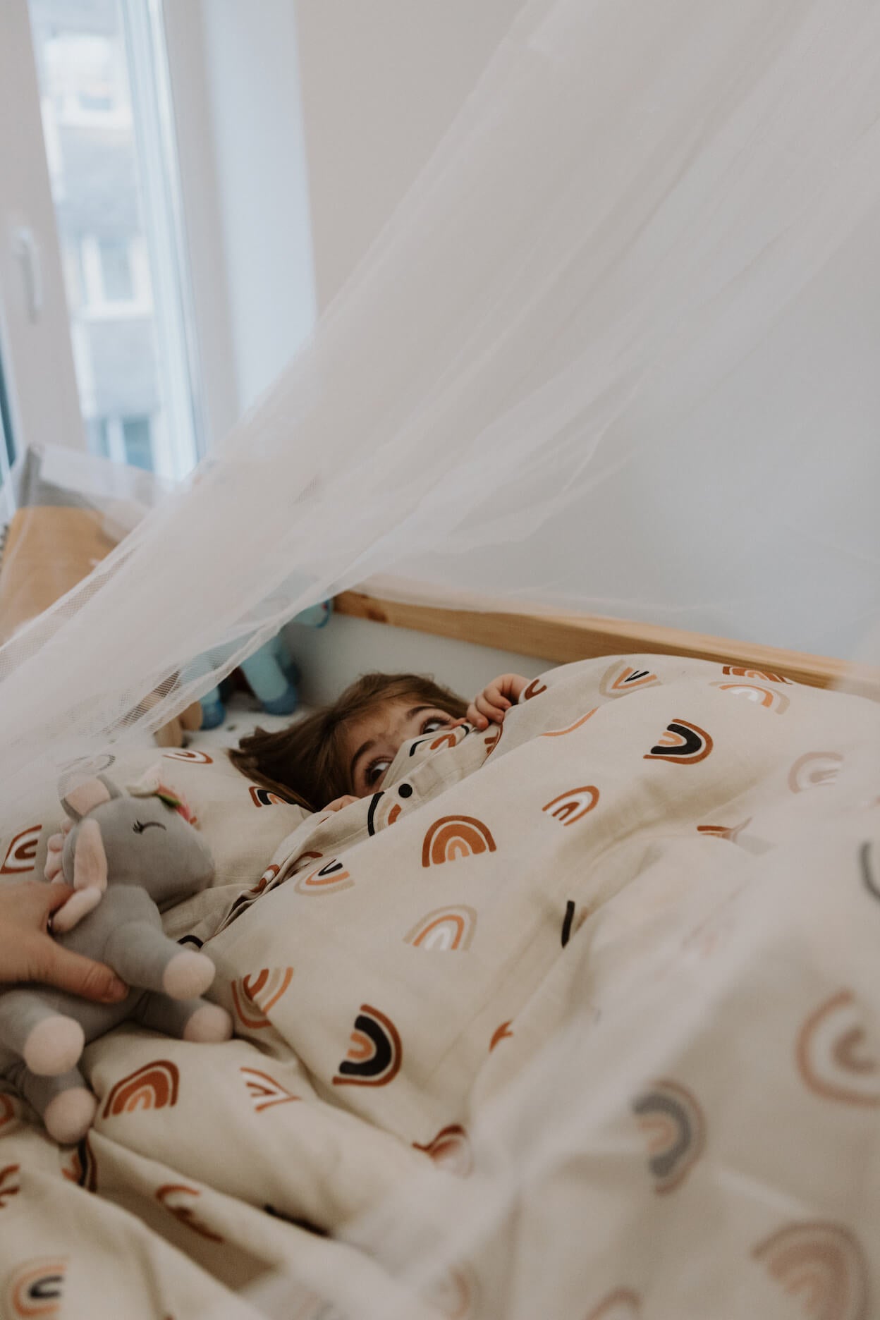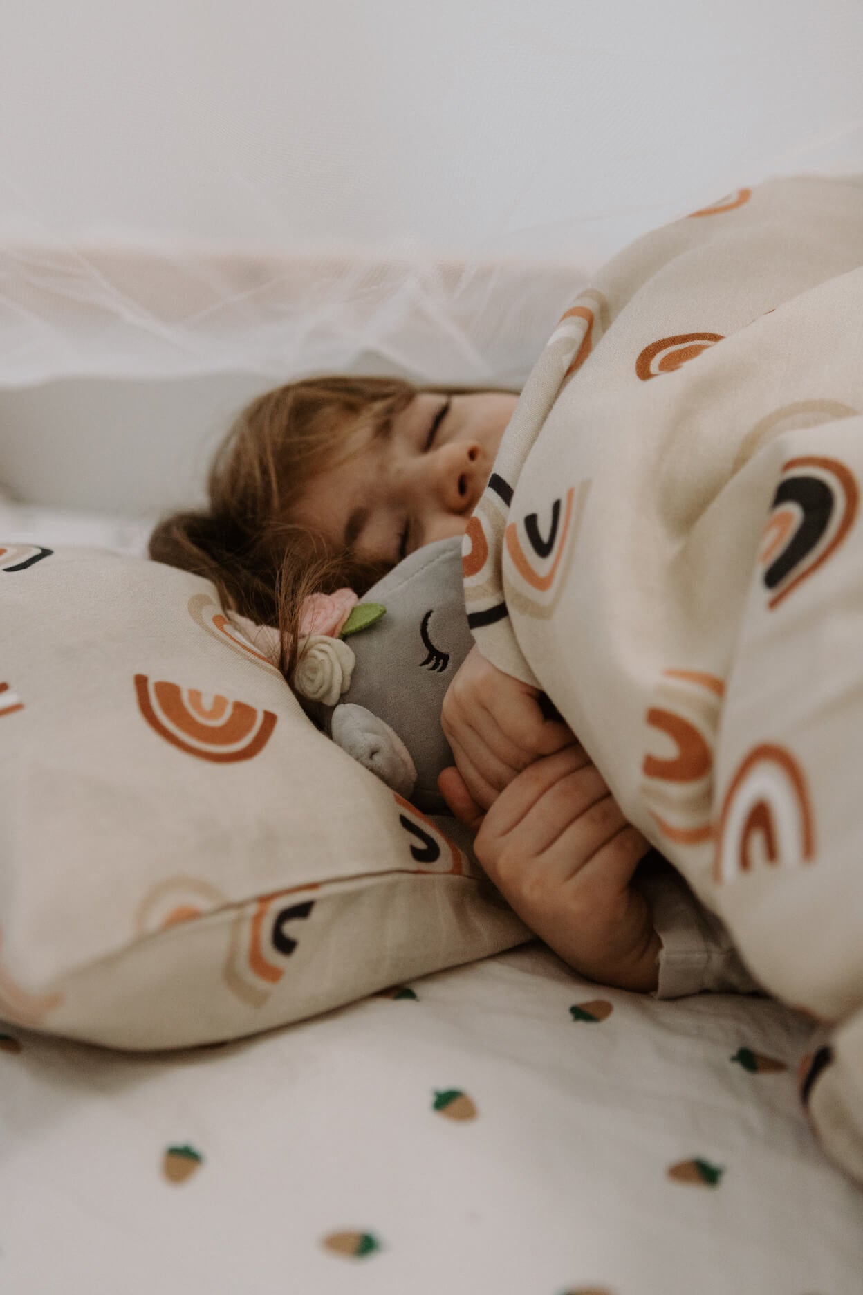 Souprava povlečení do dětské postýlky z mušelínu s certifikací GOTS. Mušelín je velmi příjemný materiál a vašim dětem se v něm bude krásně spinkat. Povlečení obsahuje jeden povlak na polštář s obálkovým zavíráním a jeden potah na peřinu se zapínáním na patentky. Nádherný design s duhami je univerzální a nadčasový.
